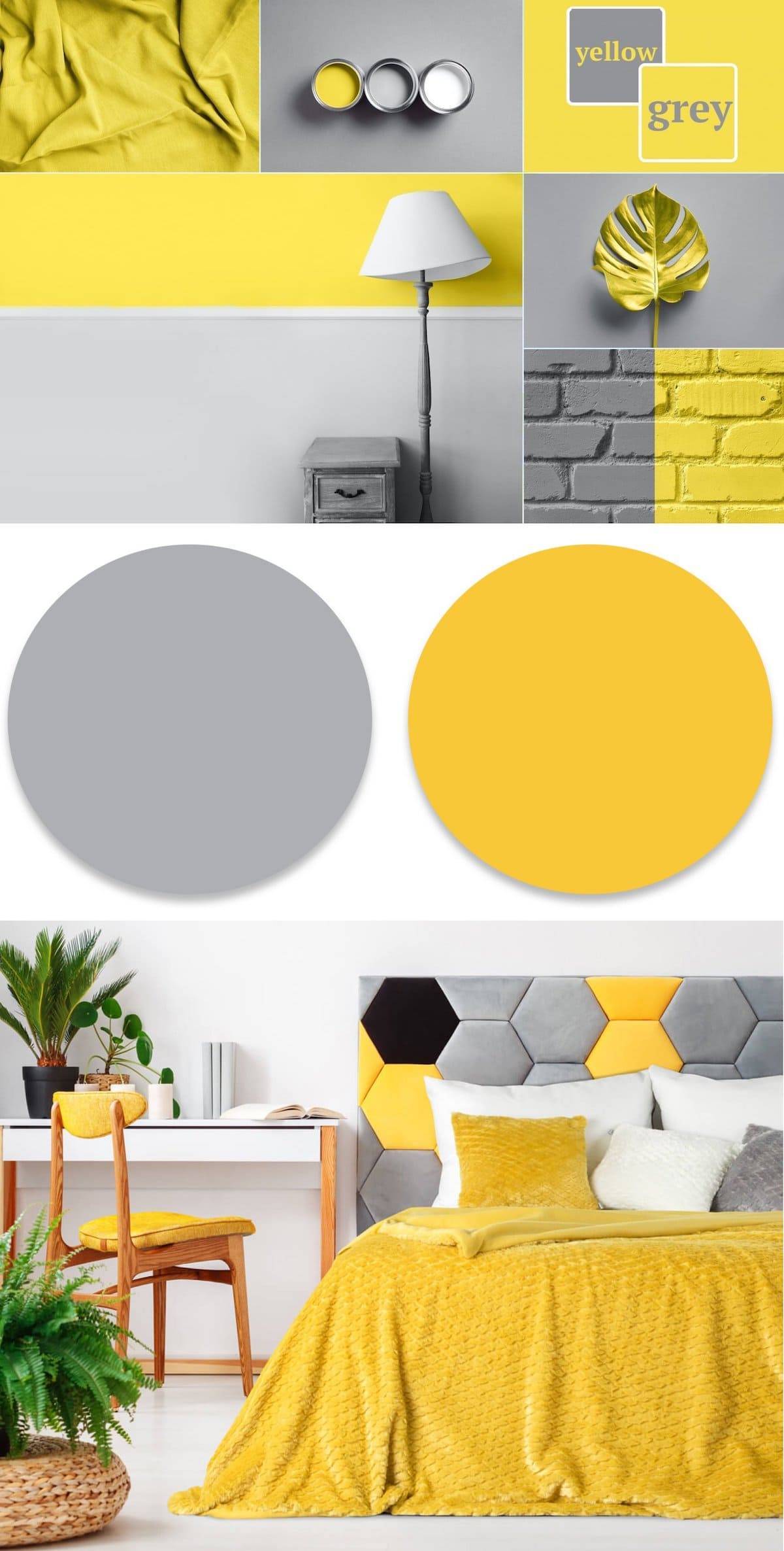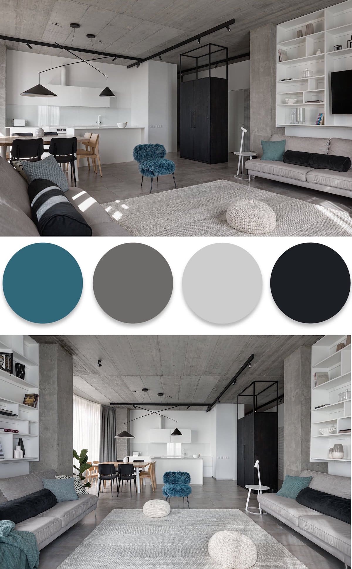 - Беж + серый (грейж). “Охлаждает” интерьер. В совокупности с небольшими яркими акцентами (желтый, коралл, бирюза), создают ощущение, что цвета буквально растворяются друг в друге.
