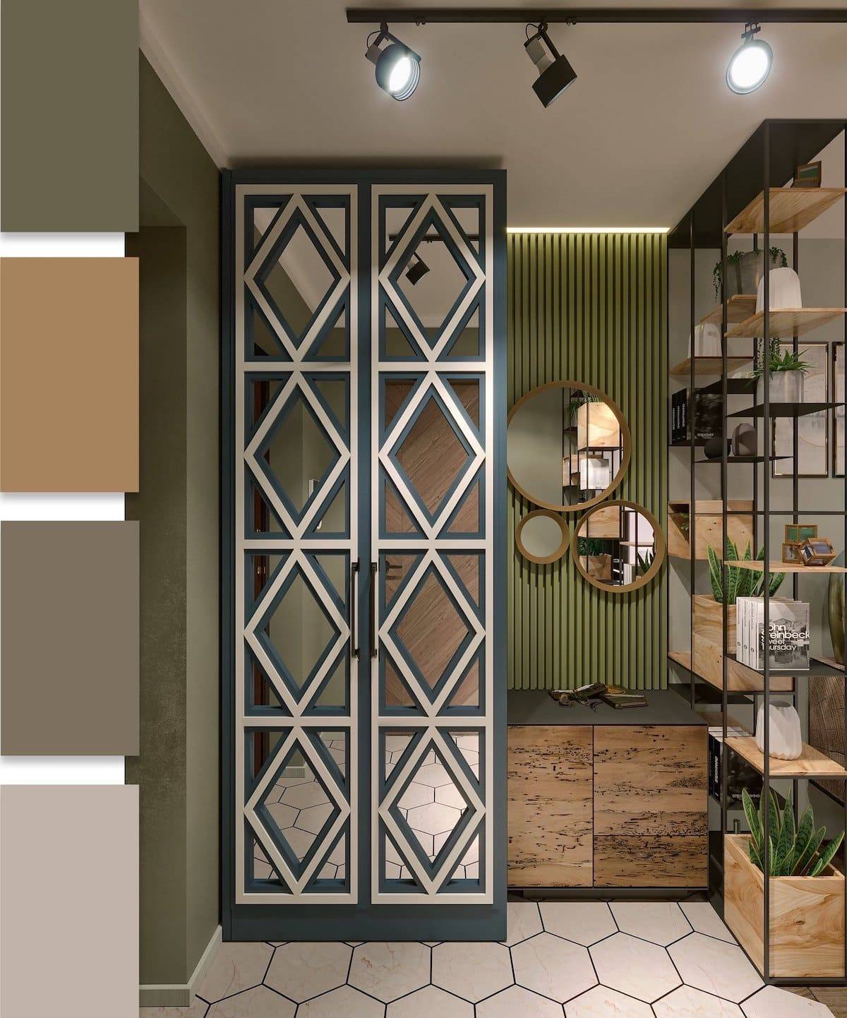 - Инструкция рекомендует подобрать межкомнатные двери, выходящие в прихожую со стеклянными элементами на полотнах. Это даст возможность насытить помещение естественным светом, идущим из других комнат.
