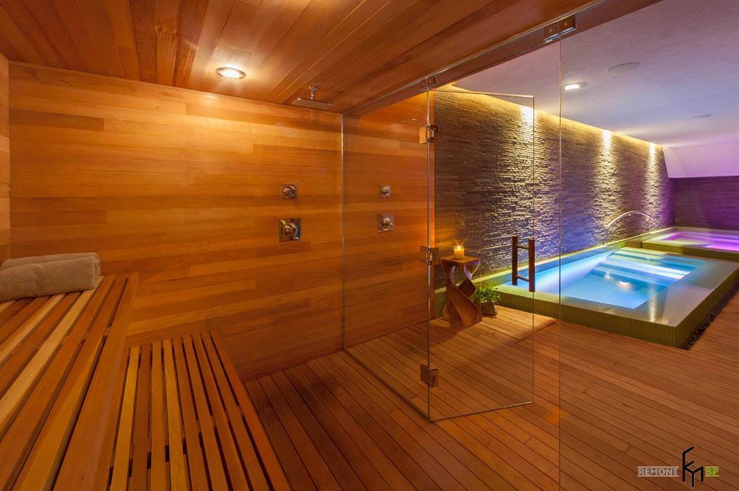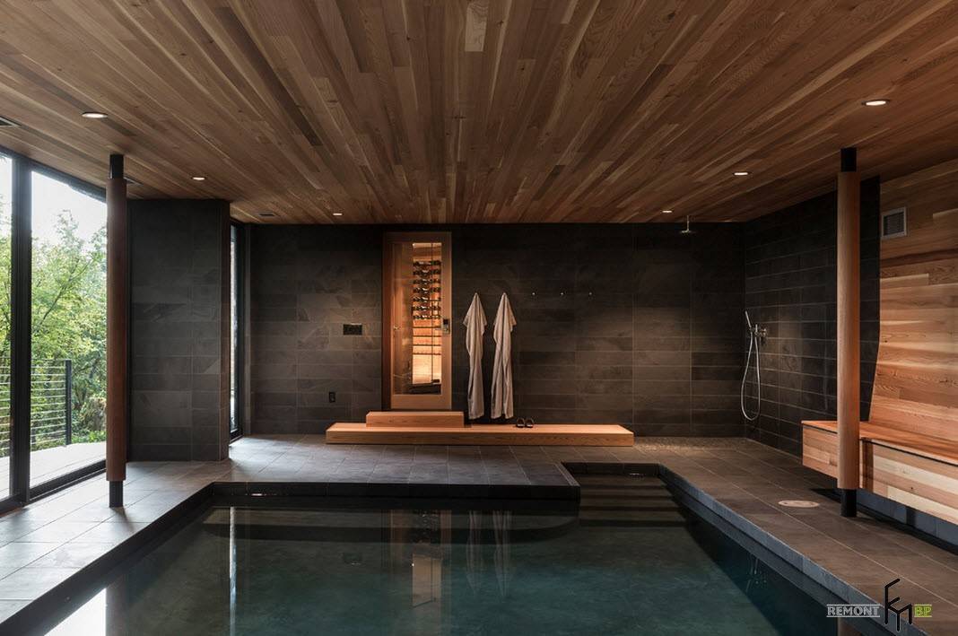 . Много стекла, дерева и – из такого бассейна не захочется уходить, особенно если в соседнем помещении будет сауна, а возле бассейна появится небольшая барная стойка и несколько шезлонгов.