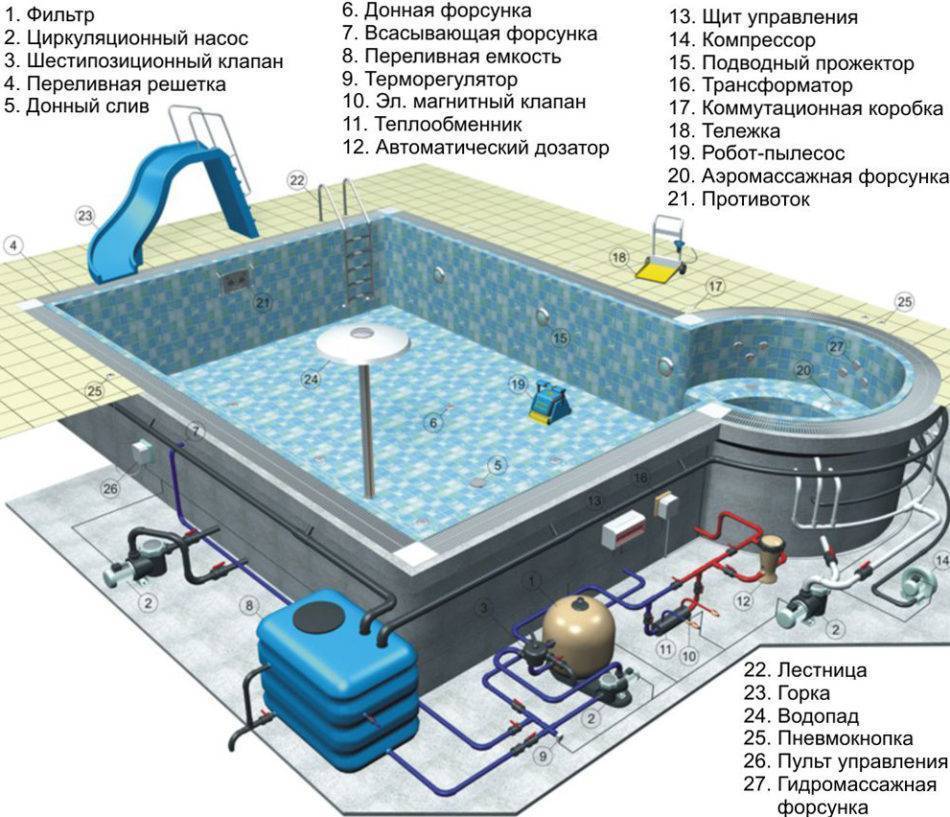 Бассейн с забетонированной чашей устройством от остальных типов сильно не отличаются. Он имеет такие же системы, которые выполняют необходимую работу для поддержания воды в необходимом состоянии.