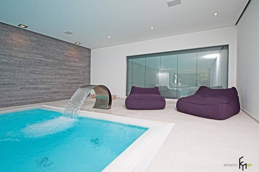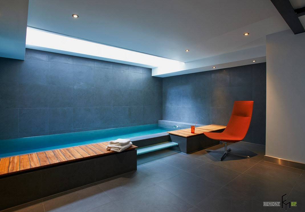 Дизайн самого помещения особых изысков также не потребует. Здесь можно обойтись лаконичными формами и нейтральными цветами. Для поднятия настроения в обстановку советуют добавить несколько красочных акцентов. Центром притяжения должен остаться бассейн с манящей водной гладью.