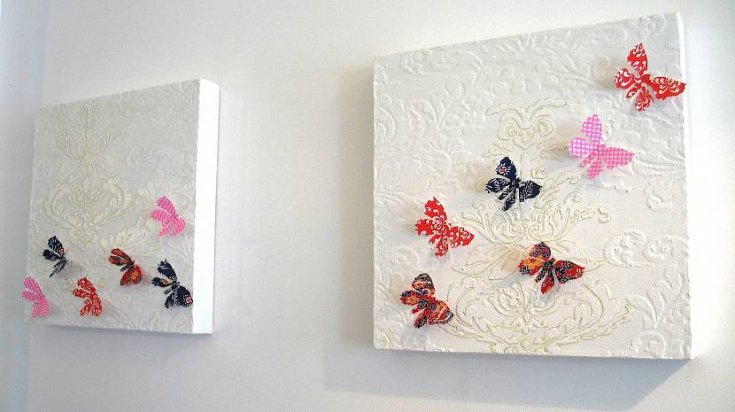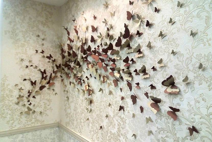 Для ее создания необходимо прикупить белый холст и упаковочную бумагу, лицевая сторона которой окрашена под «омбре» (градиент цветов). При помощи трафарета из нее вырезается три десятка бабочек разного размера. После остается лишь собрать их в стайку на холсте, которая разлетается во все стороны, закрепить каждую бабочку клеем. Такое панно можно вешать где угодно (над обеденным столом, над диваном в гостиной, в прихожей на стене). Она неизменно будет вызывать улыбку, и радовать своей простотой.
