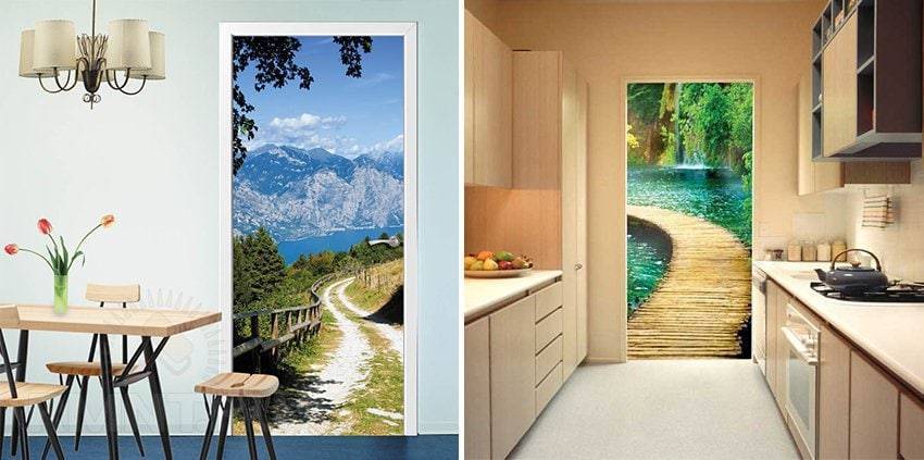 Фотообои на двери помогут за счёт увеличившейся панорамной перспективы сделать небольшую комнату визуально больше. А наклеить их очень легко, для этого даже не нужно снимать дверь с петель