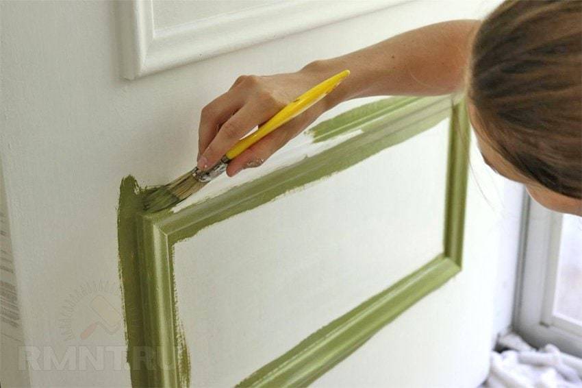 Так как необходимо работать с широкой площадью, способ нанесения играет большое значение для создания аккуратного финального вида. Мысленно разделите изделие на несколько небольших участков, равномерно закрашивая их ровными горизонтальными или вертикальными полосами. Занимаясь филенчатыми дверями, покрывайте их в такой последовательности: места вставок, центральные планки, бока.