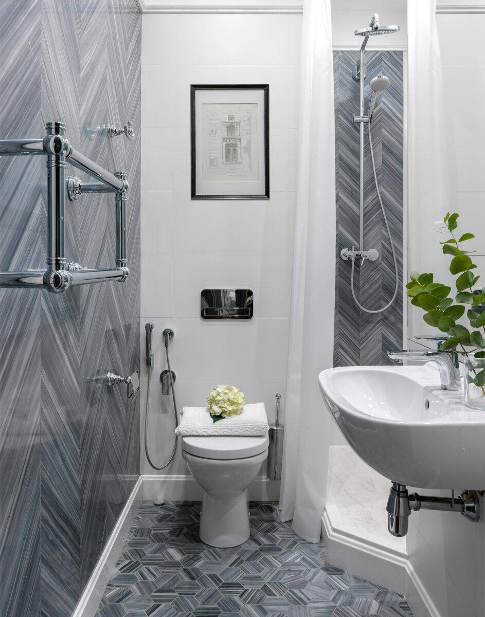 И не стоит забывать о смесителях. Они должны быть прямолинейными и лаконичными. Отсюда ясно, что небольшому санузлу больше подходят современные интерьерные направления с минимумом деталей и ровной геометрией.