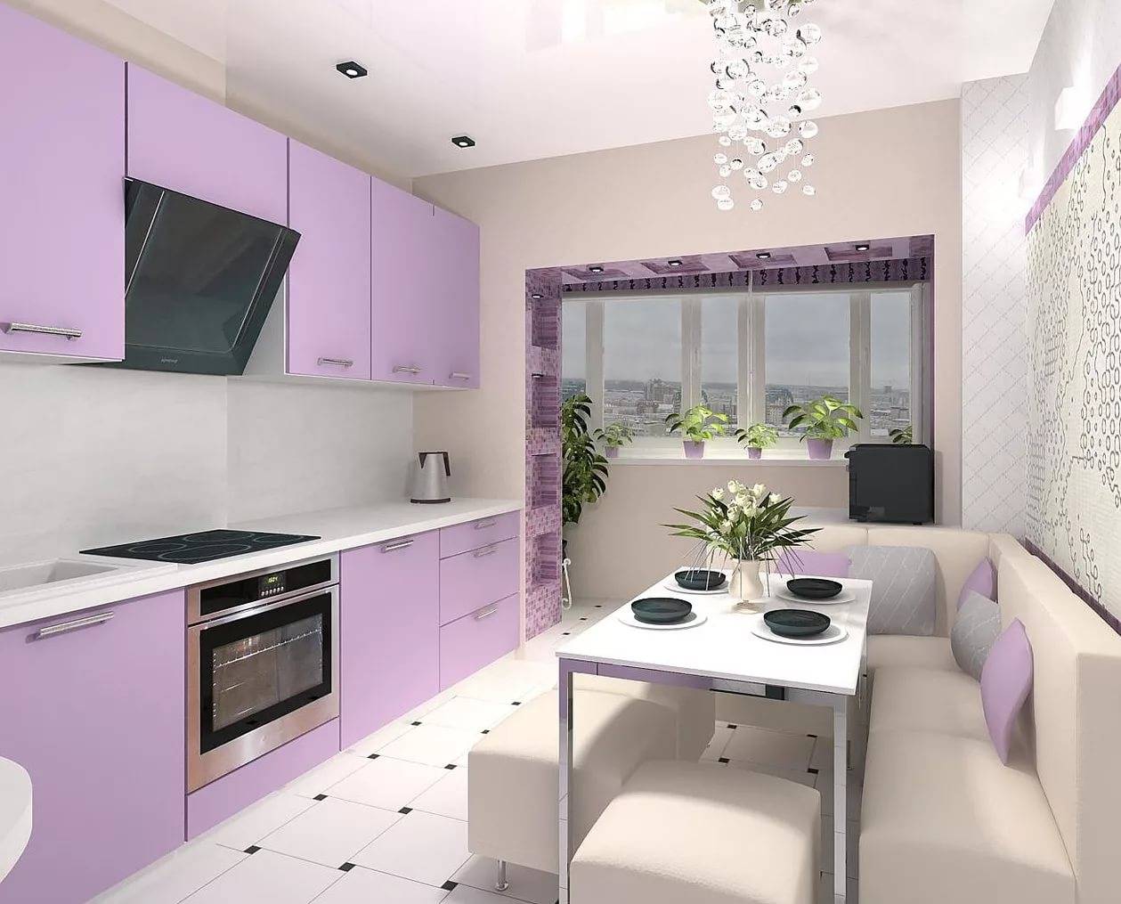 - Для небольшой кухни подойдет сочетание нежно-фиолетового с белым, кремовым, песочным, розовым, светло-голубым, серым, фисташковым.