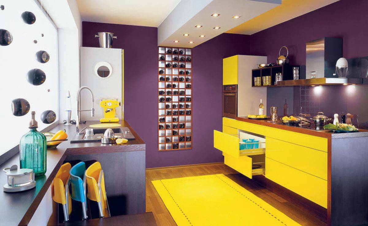 Настоящей классикой является его сочетание с белым и светло-серым, дающее эффект строгости и сдержанности. Намного уютнее выглядят пурпурные кухни с фисташковыми стенами, а также окрашенными в оттенок кофе с молоком или крем-брюле.