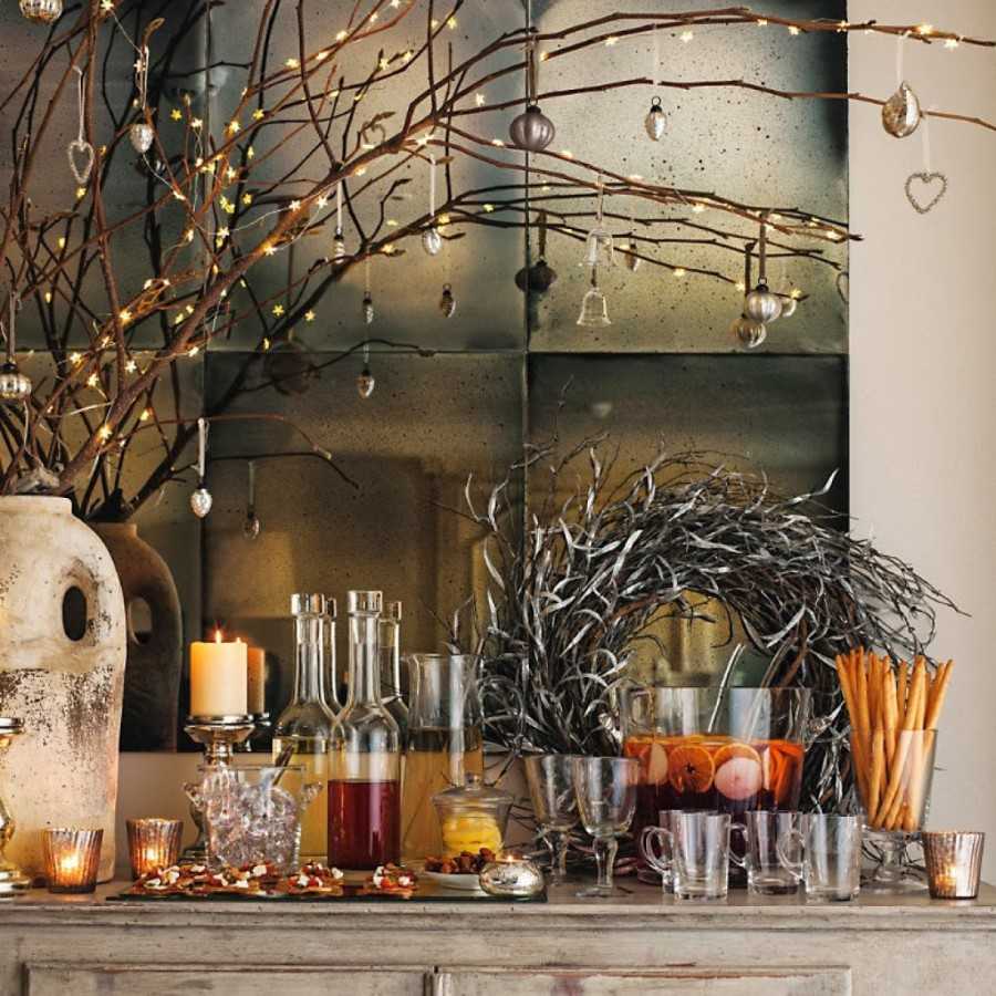 Выбеленные краской или солевым раствором ветки деревьев вешают на стену или помещают в вазу. Перед Новым годом их украшают елочными игрушками, мишурой.