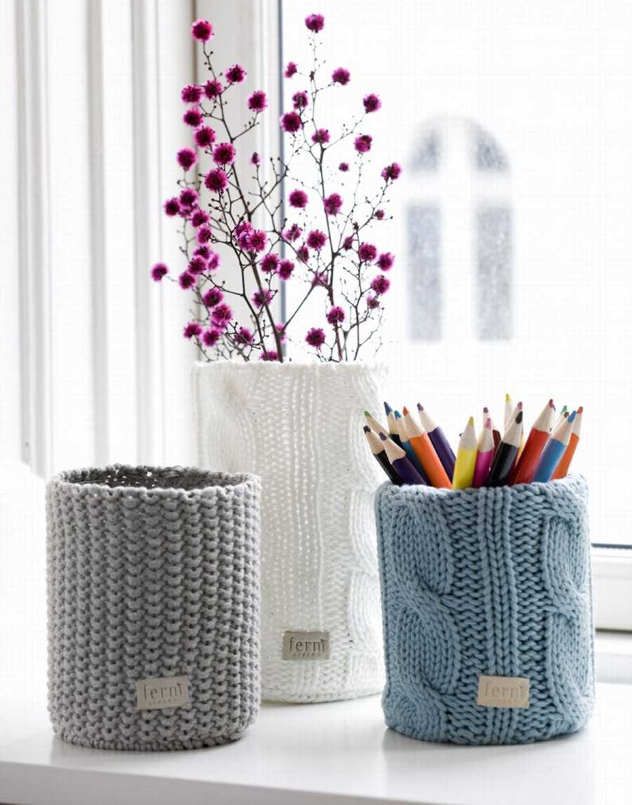 Например, вазы из бутылок, обмотанные пряжей, как на фото.