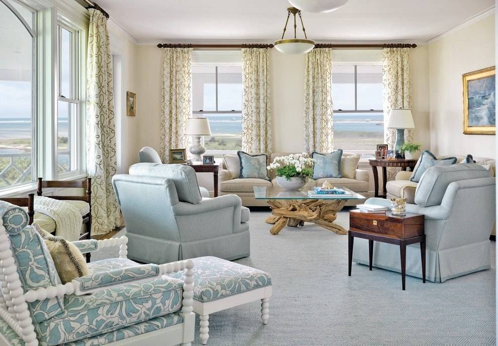 - Пастельные цвета, такие, как голубой, зеленый, желтый – прекрасный вариант для прованса. Из этого направления в небольшом зале будут уместны легкие цветочные узоры, ажурные детали без лишнего объема, натуральные материалы и текстиль.