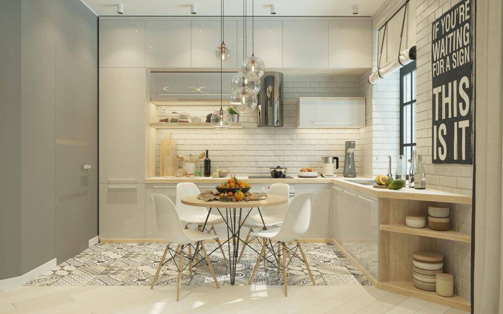 Светлые оттенки зрительно расширяют границы пространства, и придают помещению спокойный и комфортный внешний вид. В качестве ярких элементов применяется текстиль, посуда, осветительные приборы и различные кухонные аксессуары.