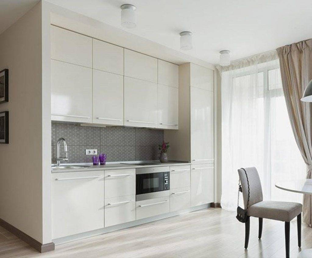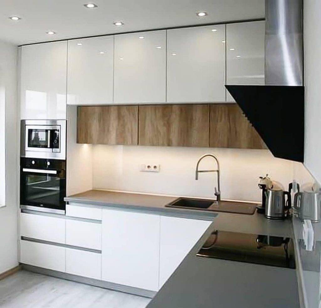 - Маленькая кухня для малогабаритной квартиры должна быть максимально функциональной. Можно использовать шкафы над обеденной зоной. Такие ящики должны быть легкими: лучше выбирать фасады со стеклянными вставками.