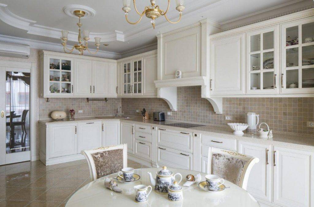 Наиболее популярным решением является белая кухня в классическом стиле. Этот цвет всегда выглядит нарядным, торжественным и чистым. Интерьер становится просторным, а обстановка – величественной. Но дизайн даже гарнитуров из МДФ никогда не бывает однотонным: каждый подобный проект использует отделку в виде позолоты. Как правило, ее наносят на ручки фасадов, на сами фасады в местах фрезеровки, на потолочную лепку, при этом аналогично могут декорироваться вытяжка, буфеты с витриной и другие детали.