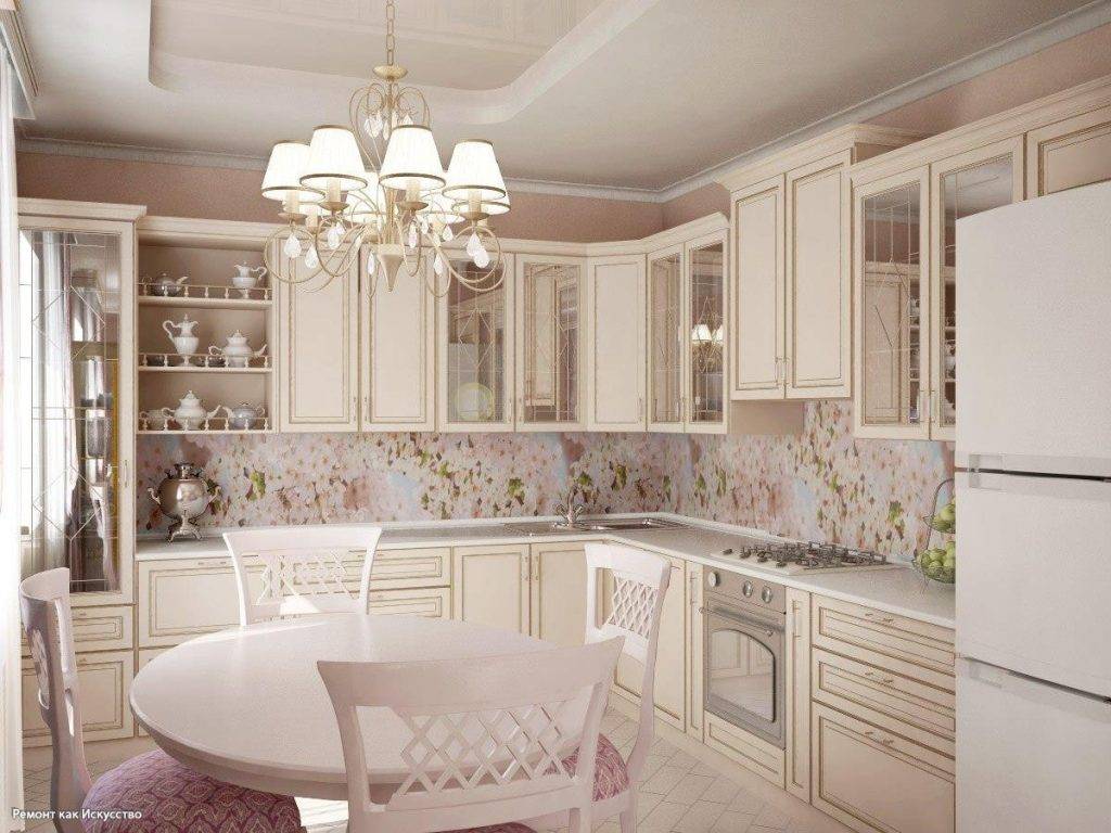 Такая кухня придется по душе практически всем. В данном стиле все сдержано, но не строго. Отлично впишется кухонный гарнитур из массива в светлом цвете с классической фурнитурой. Для освещения можно подобрать «хрустальную» люстру. Обеденная группа должна быть выполнена из тех же материалов, что и кухонных гарнитур. В качестве декора можно использовать вазу с цветами, фарфоровую посуду в серванте или шторы из легких материалов.