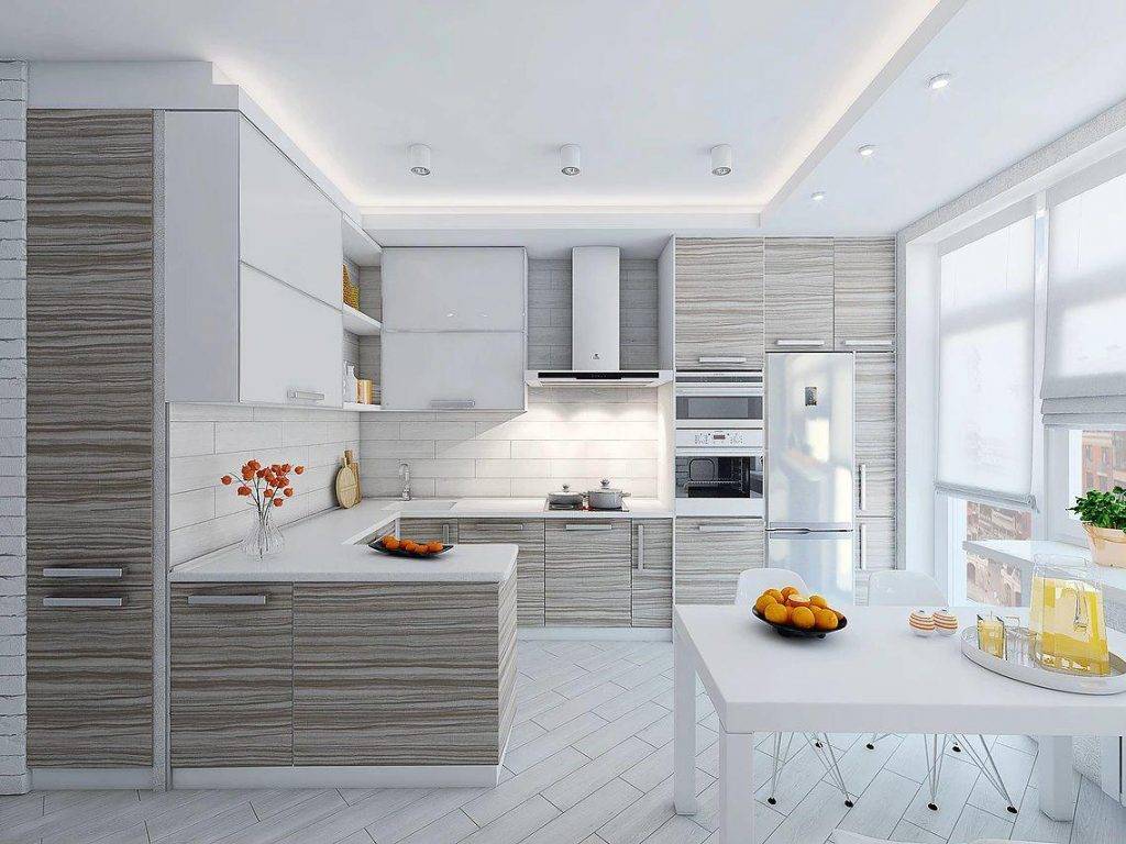Для него характерны простота и практичность. С помощью светлых оттенков кухня получится не только современной, но и визуально просторнее. Кухонный гарнитур должен быть сдержанным, без вензелей и резных фасадов. Встроенная бытовая техника будет отличным решением. В качестве занавесок для окон стоит использовать жалюзи или римские шторы.