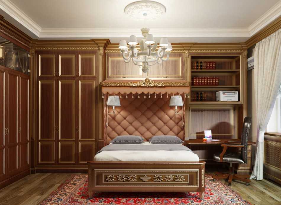 Кровати, шкафы и комоды выполняются их ценных пород дерева. Дизайнеры предлагают оставить натуральный оттенок древесины, что будет подчеркивать роскошь интерьера.
