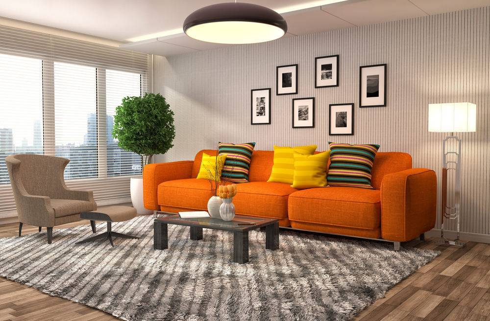 Оранжевый цвет сам по себе считается теплым, поэтому легко сочетается с разными оттенками. Такой диван легко комбинировать со светлым деревом, например, дубом сонома. Металл также выгодно сочетается с такой мягкой мебелью – подобный тандем подойдет для минималистического стиля.
