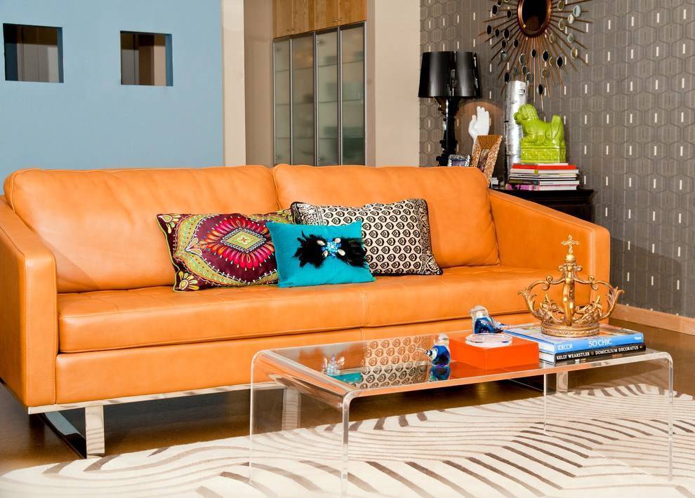 Чтобы оранжевый диван оказался практичным, рекомендуется выбирать материал, легко поддающийся уходу. Например, натуральная кожа, хоть и имеет высокую стоимость, но в оранжевом цвете будет выглядеть великолепно. Кроме того, его чистка не доставит трудностей. Натуральная ткань типа хлопка подойдет природным интерьерам, но стоит помнить о том, что такой материал недолговечен.