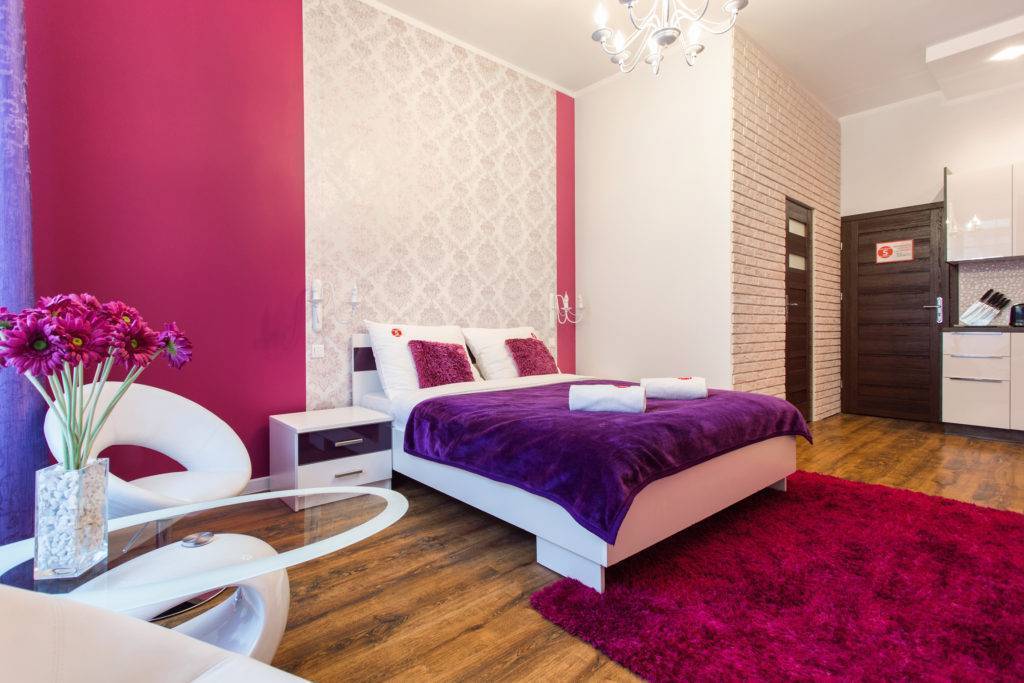 - Фиолетовый используется, как преобладающий основной цвет. Покраска стен, полового покрытия, потолка, даже шторы оформляются в этой гамме, остальные мелкие предметы используются в спокойных или контрастных тонах.