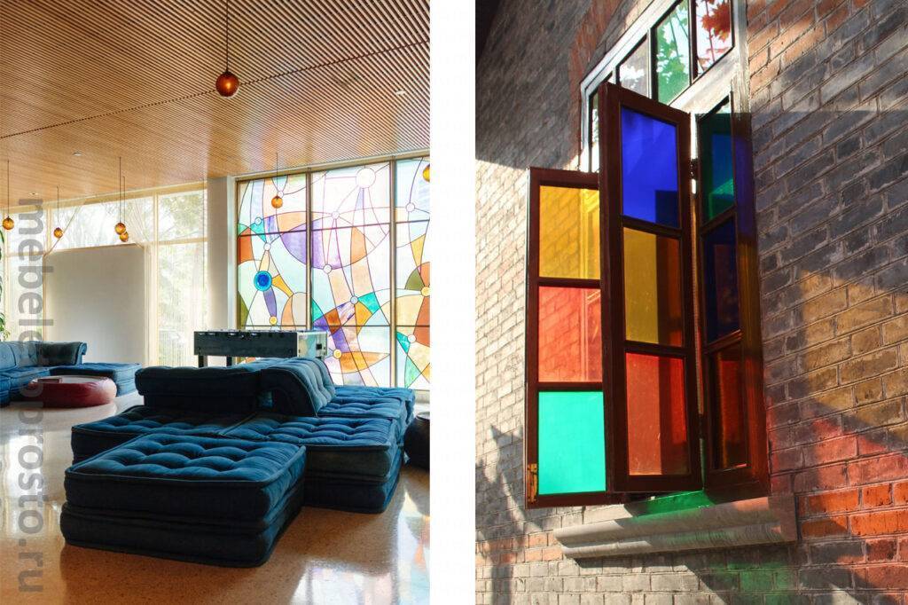 Окно с витражами в виде сплошного светового пояса иллюзорно увеличивает высоту помещения
