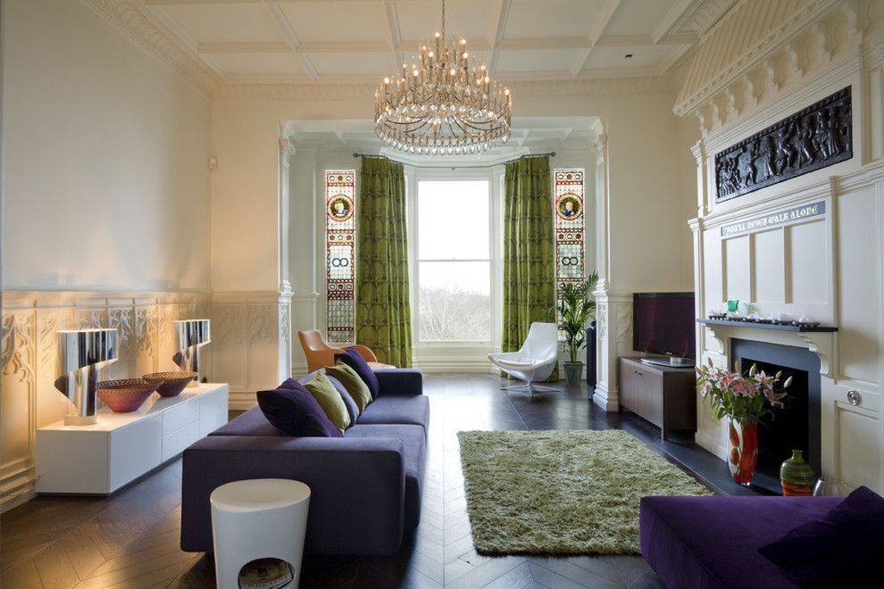 В гостиной комнате высокие окна лишь немного украшены витражами