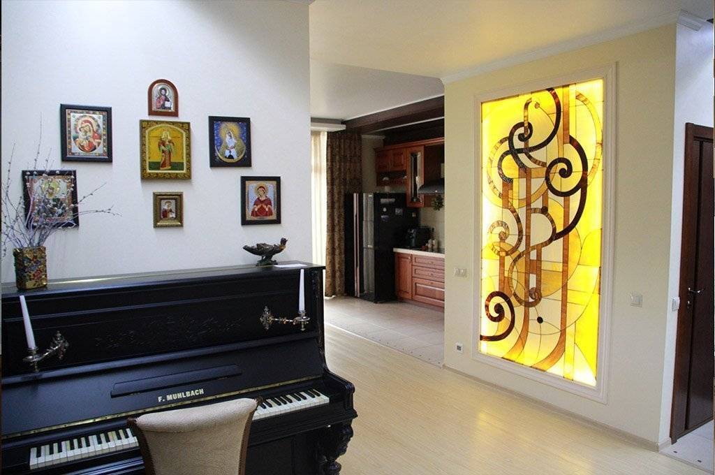 Прихожая. Подвесной витраж с подсветкой — хороший вариант для помещения, в котором нет окон.