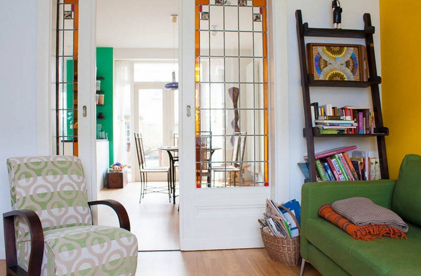 - Перегородки и ширмы с витражным остеклением отлично подойдут для зонирования. Например, для отделения зоны готовки в кухне-гостиной. Или для обустройства домашнего кабинета в спальне или гостиной.