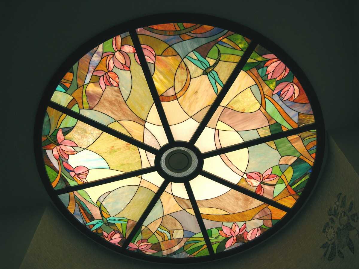 - Потолок с витражной вставкой также является атрибутом загородного строительства. А для квартиры можно оборудовать витражный подвесной потолок с подсветкой. Такой способ оформления сделает помещение визуально выше и просторнее.