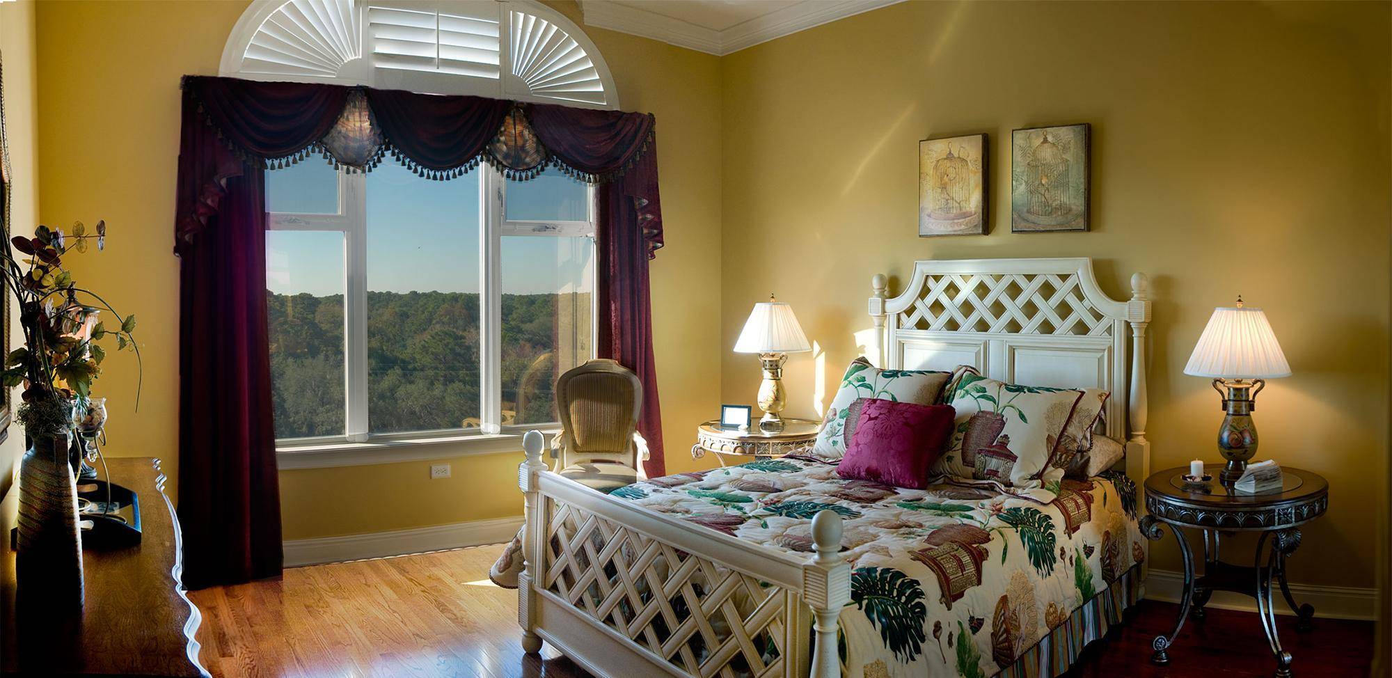 Спальня – место для спокойного отдыха и уединения. Обилие текстиля, подушек, тканей, мягкого света, шкафчиков и зеркал с трюмо. Удобно, уютно, комфортно. Очень часто в оформлении спален используются занавеси и тканевые самодельные вязанные шторы. Неизменным атрибутом становится кровать из натурального дерева и небольшие светильники.