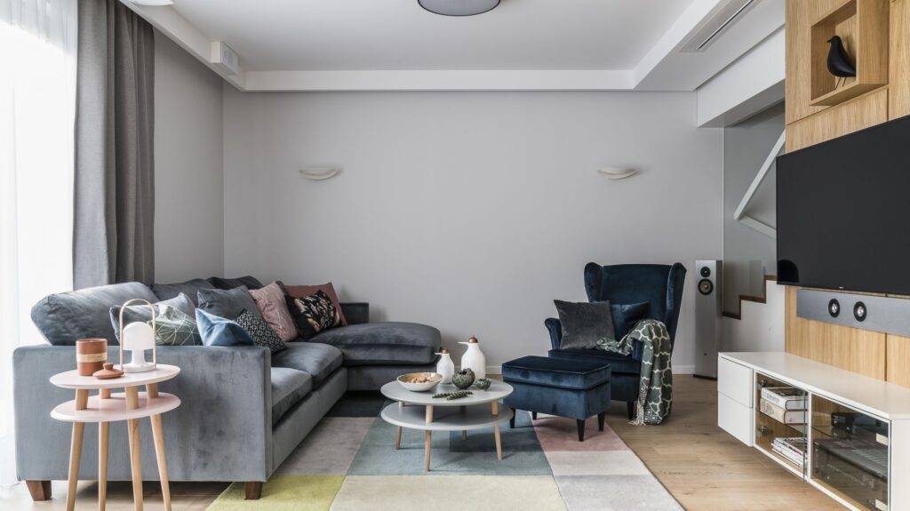 На фото холодные оттенки в сканди-гостиной