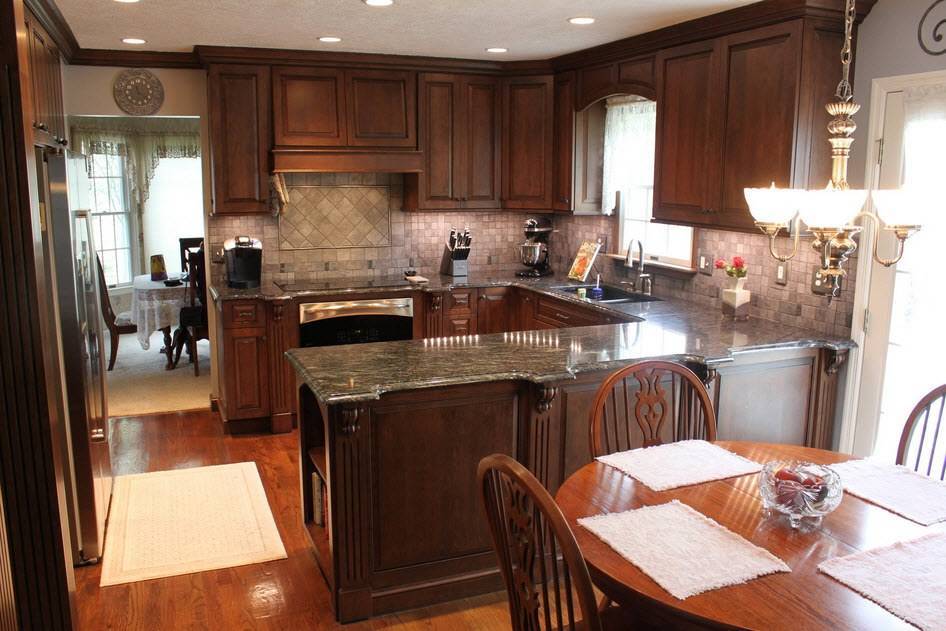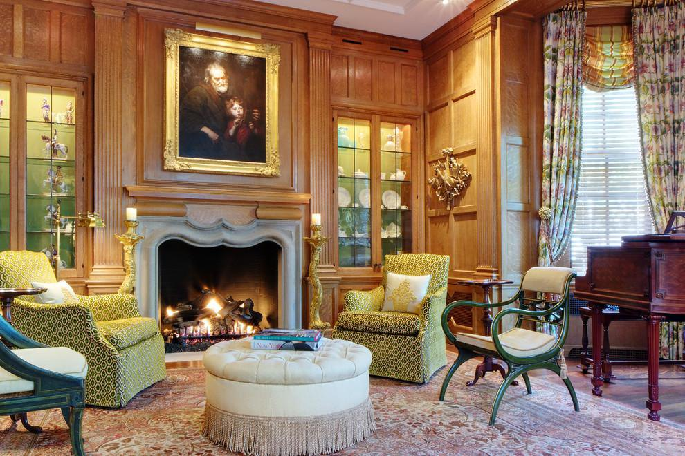 Строгий интерьер столовой с акцентом на английский стиль с темным деревом, пилястрами и камином