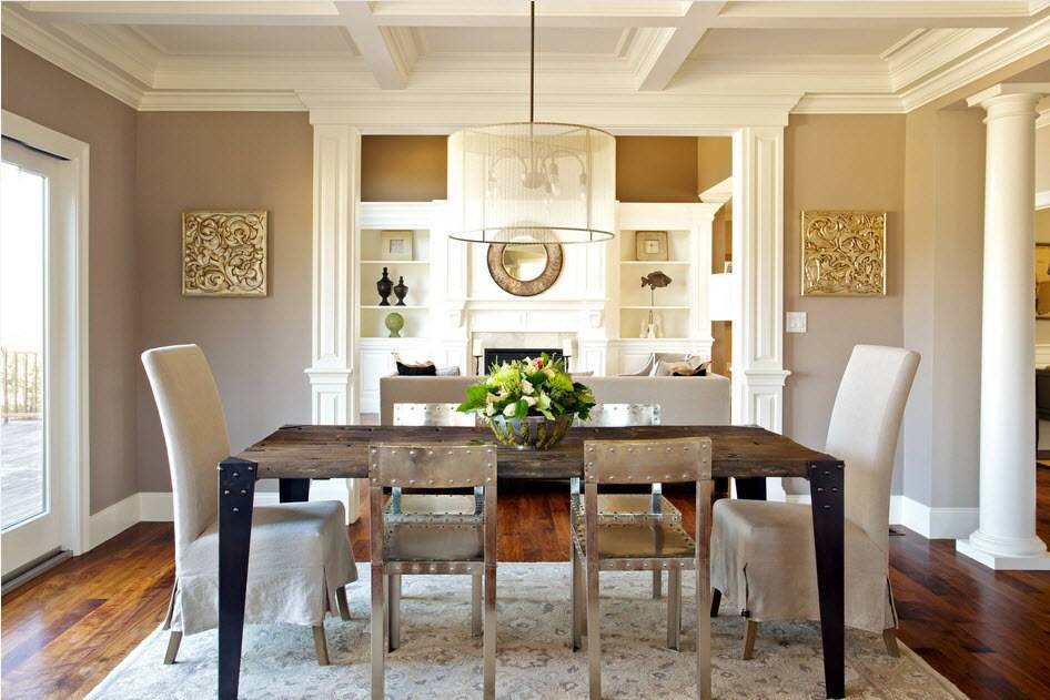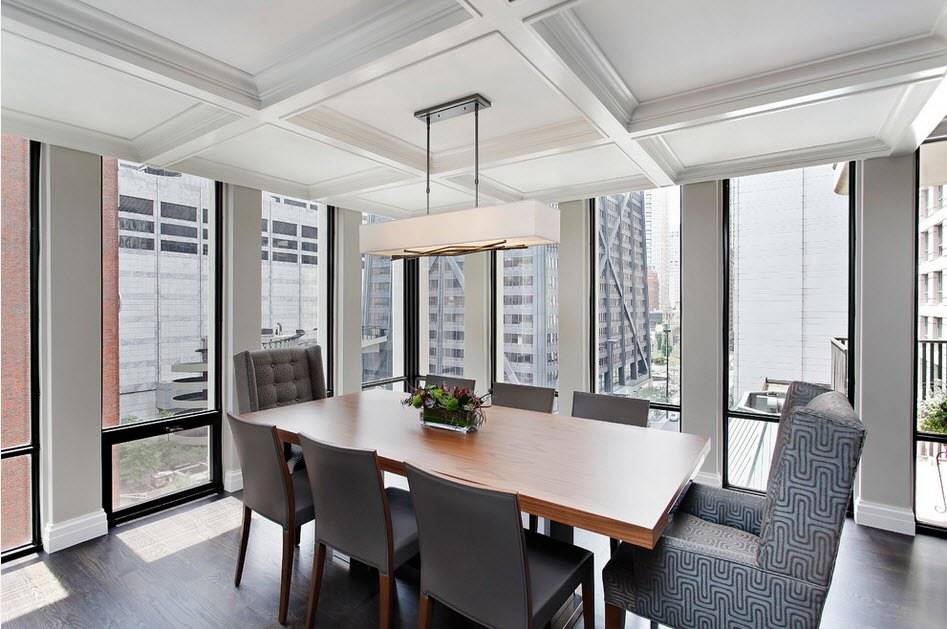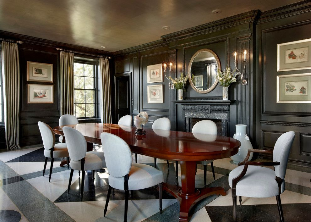 Пилястры в отделке стен черного цвета придают особой роскоши этой обеденной комнате
