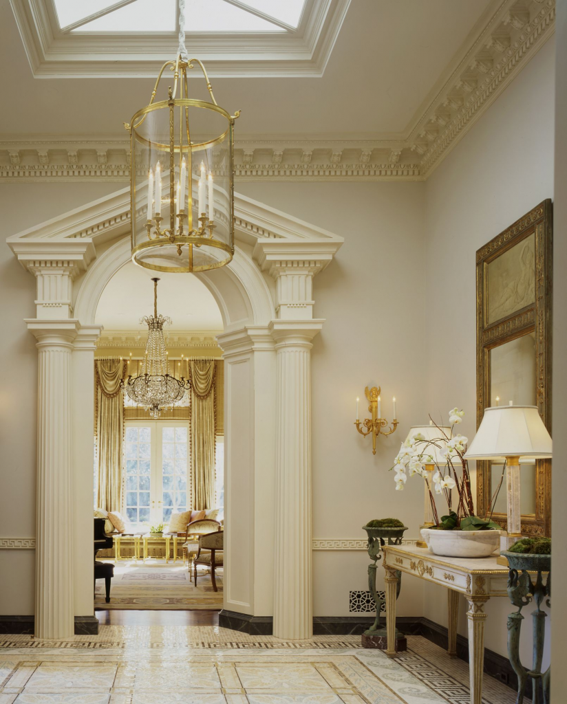 Интерьерный стиль ампир предполагает использование в оформление помещений колонн, полуколонн и арочных входов. Сочетая пилястры с другой лепниной можно создать помещение в стиле античного храма. Например, использовать потолочные плинтусы, карнизы, лепнину в зоне люстры. Именно такие дизайнерские решения древнегреческих архитекторов и в наше время восхищают ценителей прекрасного.