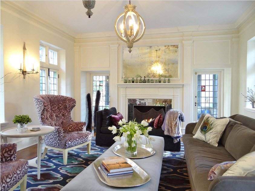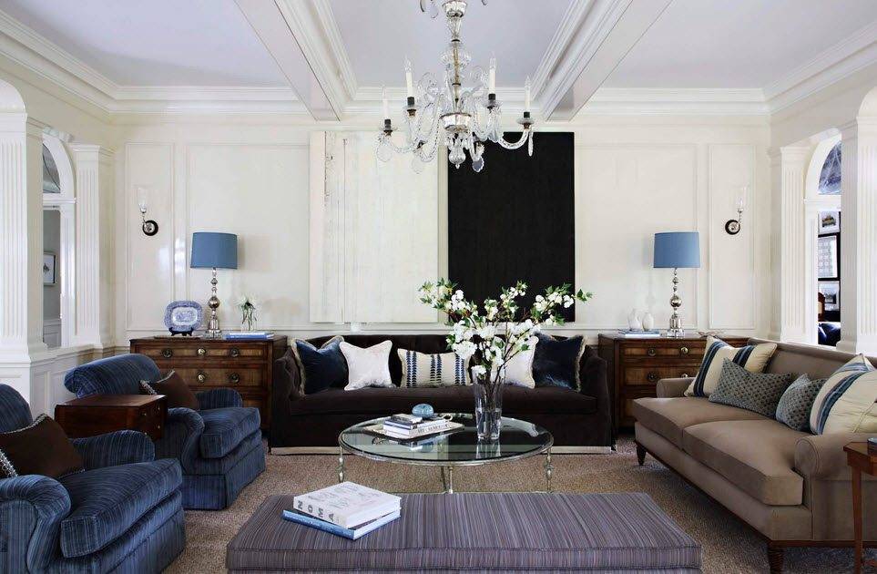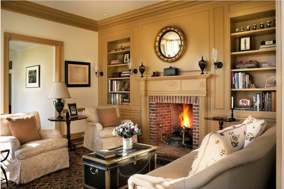 Совместно с пилястрами используйте в оформлении гостиной зеркала. Их можно разместить в роскошных рамах, украшенных лепниной. Этот эффект поможет воссоздать в комнате единый стиль. Если не хотите использовать зеркала, то замените их картинами или оригинальными панно.