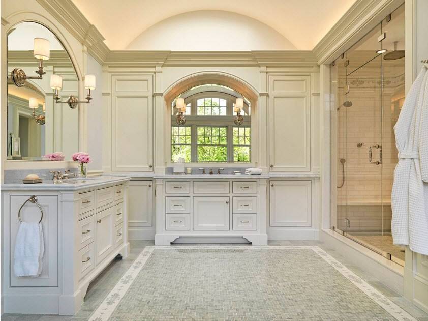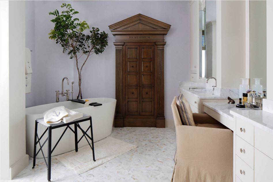 Необычная ванная комната с большими окнами, колоннами и пилястрами