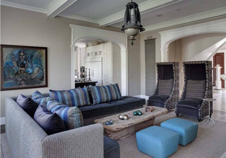 Часто гостиная, где есть пилястры, дополнительно украшается художественной росписью на античную или библейскую тематику. Также разрешается использовать: