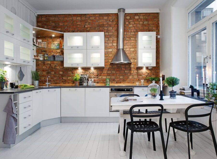 Вытяжка — обычно вытяжка располагается над духовкой, в которую уже встроена лампа освещения. Тем не менее, вы можете выделить процесс приготовления пищи с помощью настенного устройства (предпочтительно термостойкого стекла) или лампочек направленного действия.