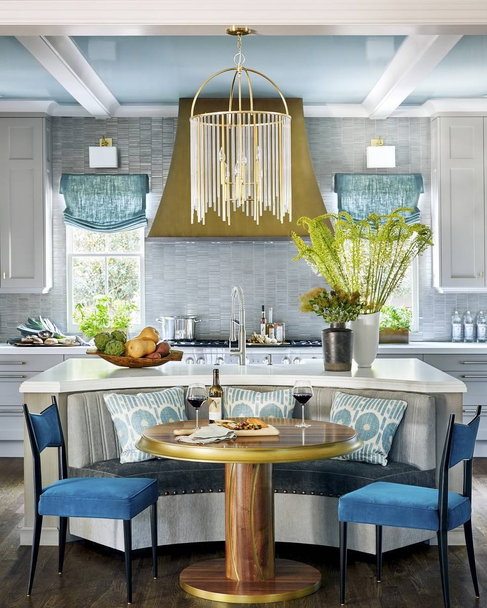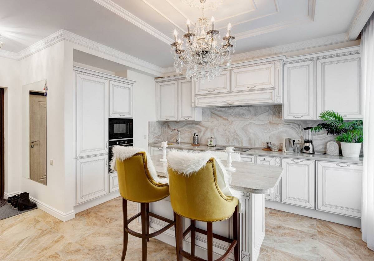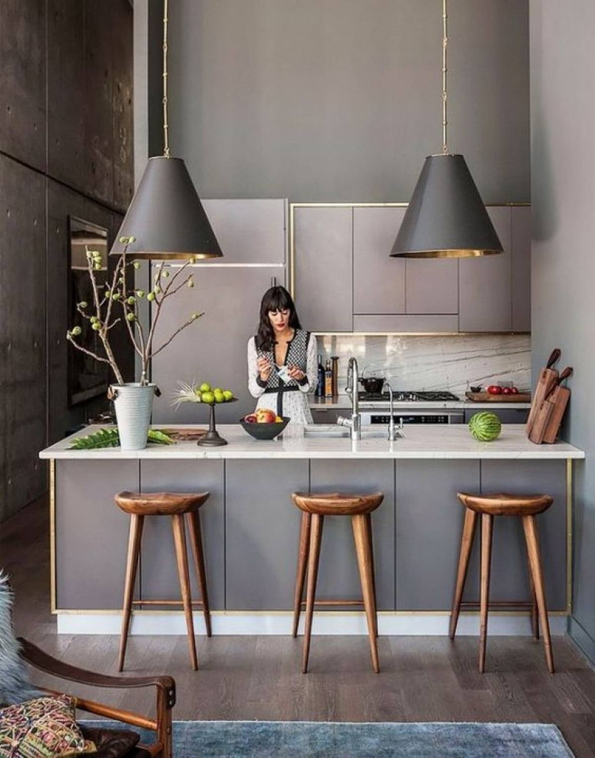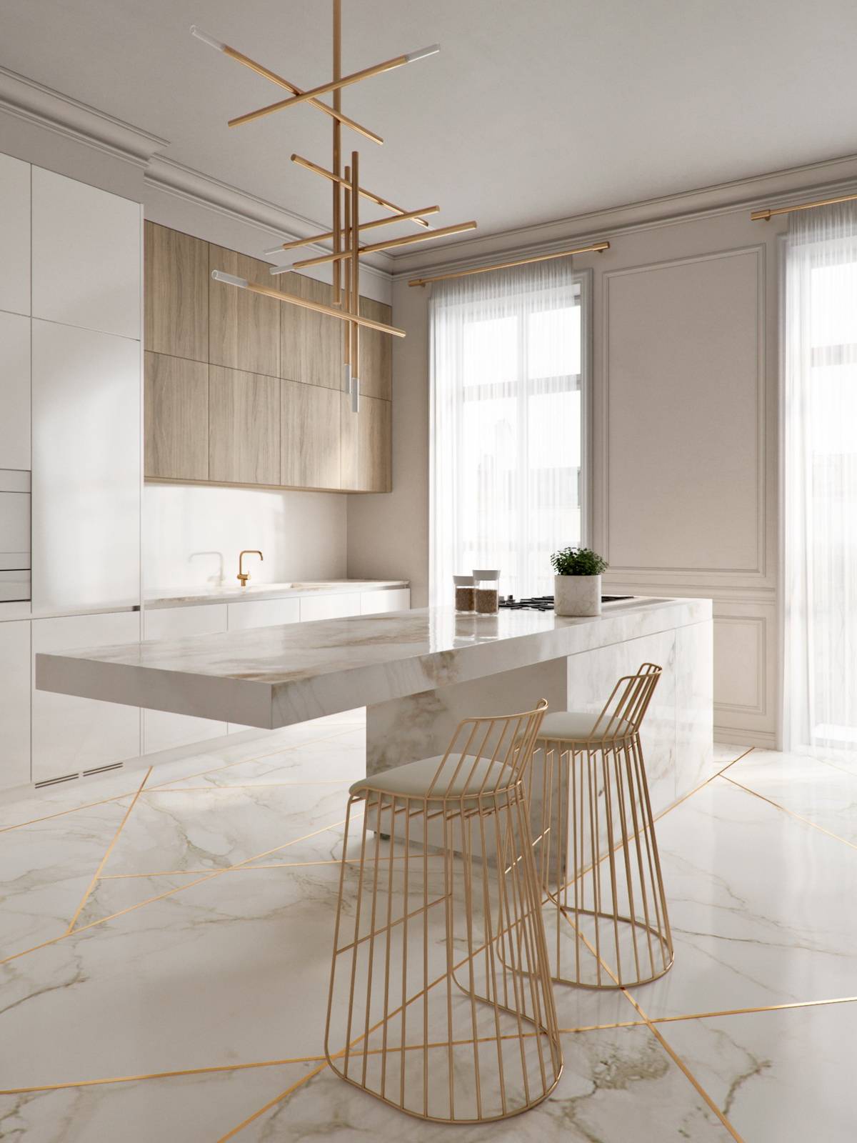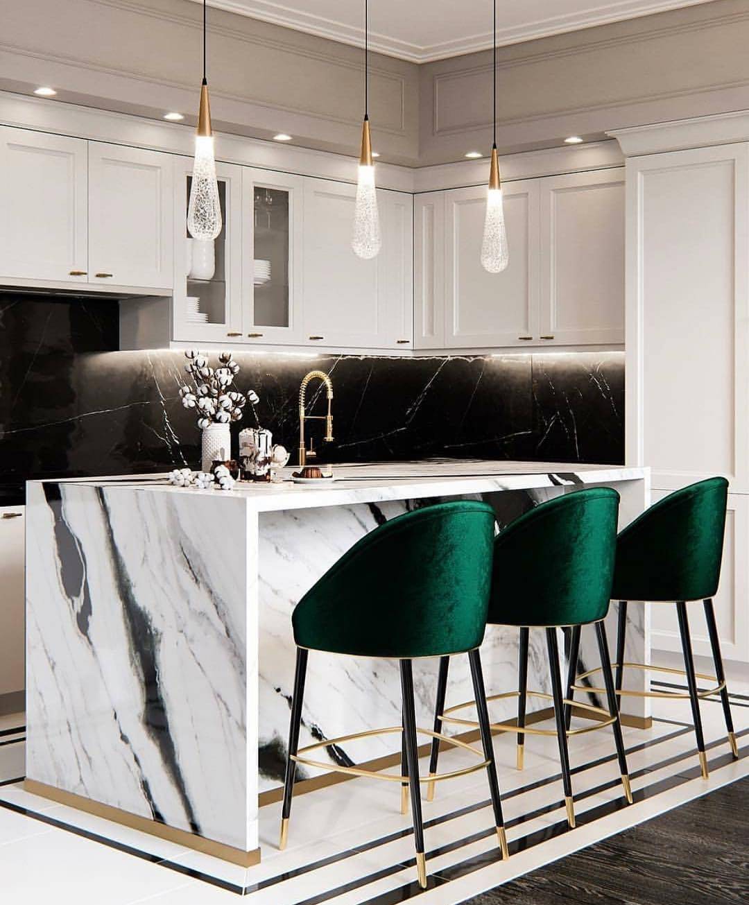 Если вам нравится элегантный классический стиль, выбирайте мрамор. Из него изготавливают различные кухонные принадлежности, настольные и подвесные светильники, столешницы и подоконники. В 2021-2022 году также по-прежнему будут в моде медь и золото.