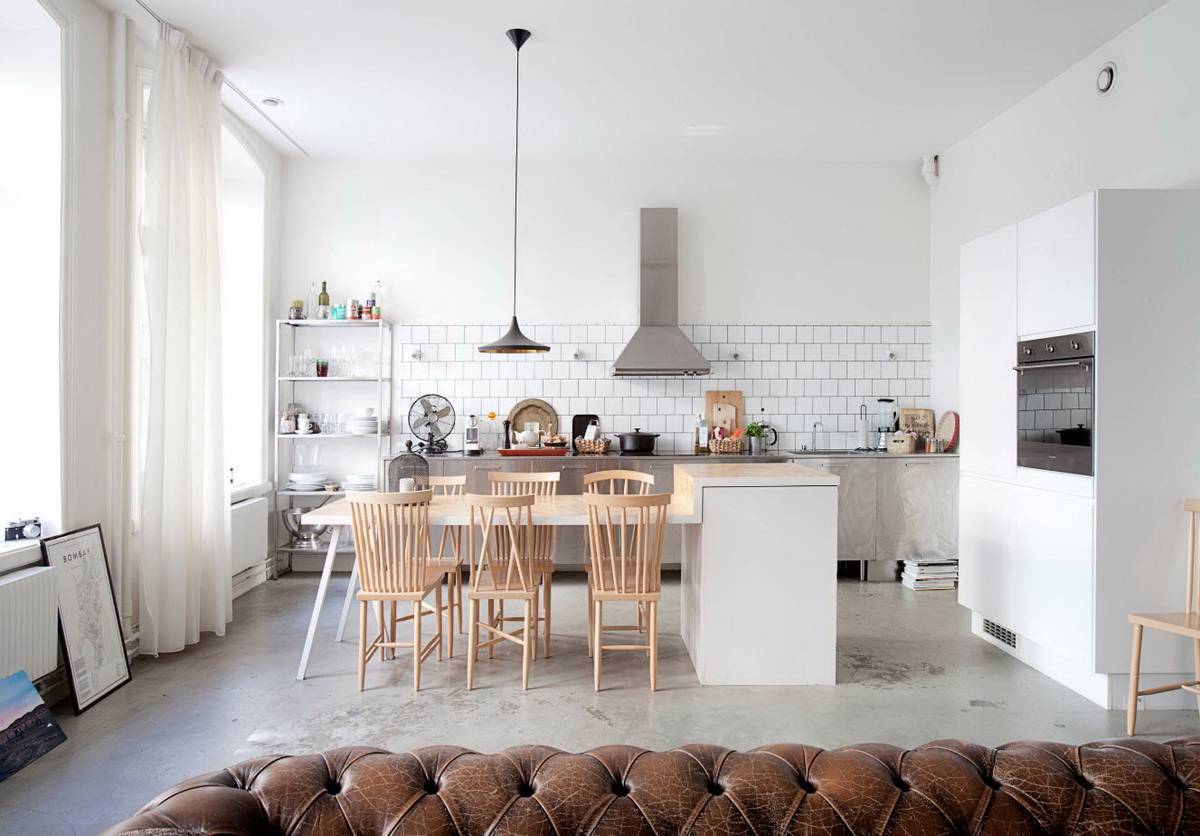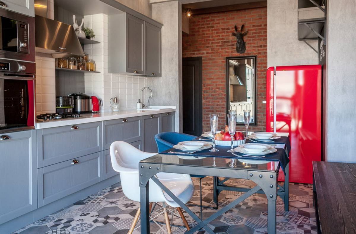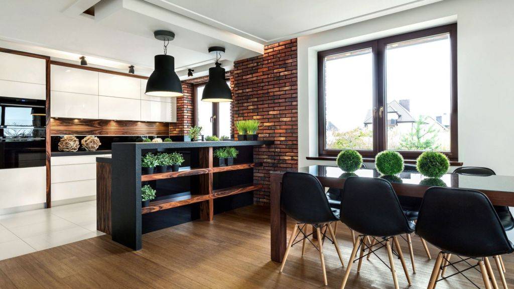 Дизайн лофт отличается оригинальным зонированием при помощи мебели. Кроме того, в нем сочетается сила и красота, выражающаяся в грубой отделке с присутствием открытых металлических конструкций. Но как и в классике, тут присутствуют удобство и комфорт, дополненные функциональностью. Кухонный стол, оформленный под стиль лофт, отличается минимализмом и натуральными материалами.