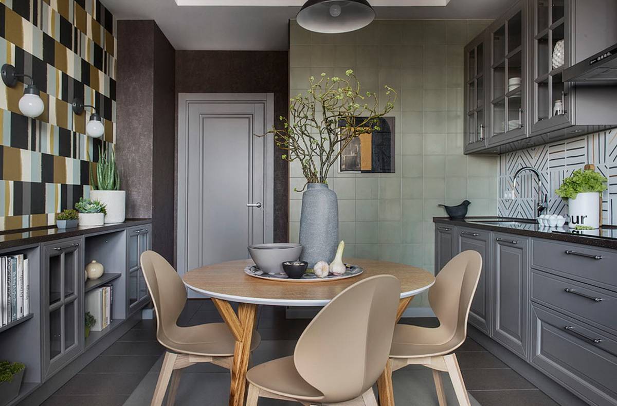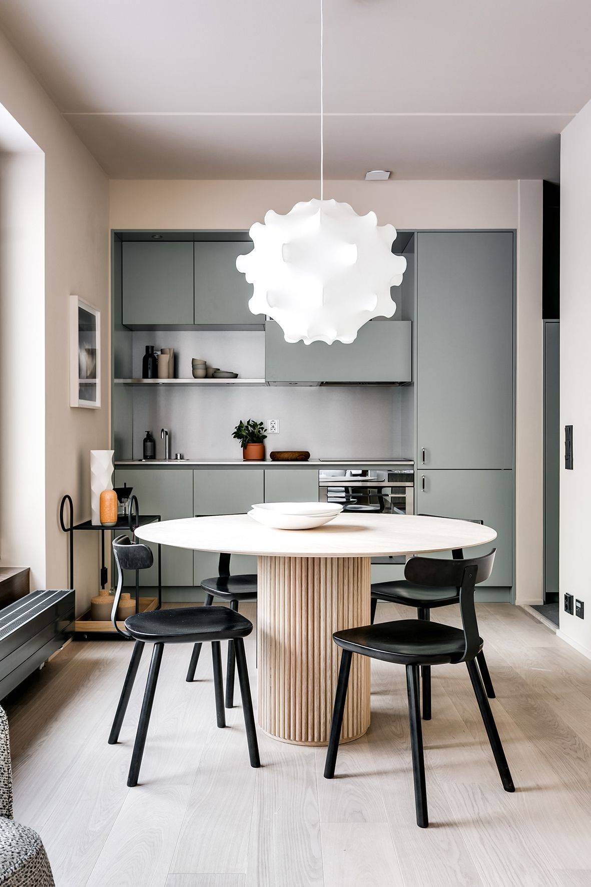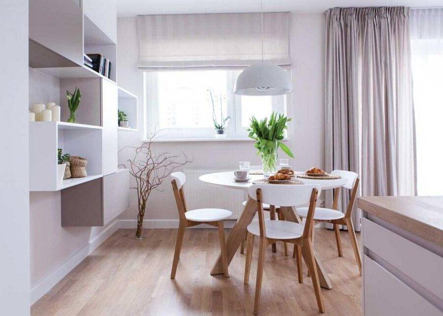 На фото круглый белый стол в интерьере небольшой современной кухни.