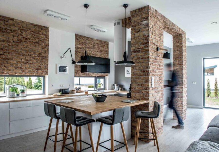 Дерево хорошо сочетается не только с металлом. Сочетание дерева и камня также подойдет для модной кухни 2021 года. Вы можете положить, например, на каменный пол, каменную столешницу или фрагмент стены, например, над столешницей. В сочетании с деревянной мебелью или столешницей из массива вы получите интересный, модный эффект.