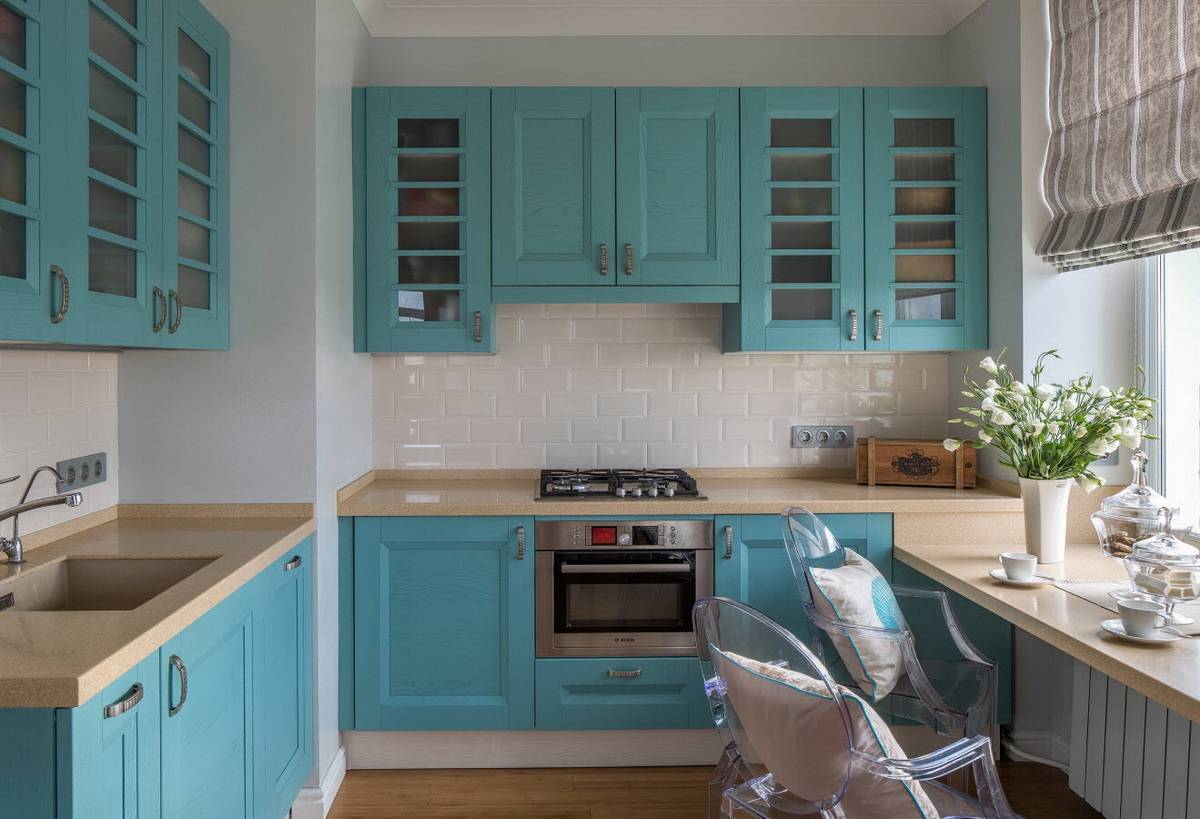 Угловая кухня с необычными фасадами в квартире-хрущевке.Продумывая такую планировку с обустройством мойки и рабочих поверхностей под окном (и прочие перепланировки, показанные в статье), не забывайте сверяться со СНиП. Некоторые перепланирования помещений и вмешательства в отопительную систему многоэтажных домов, особенно панельных, возможны только частично