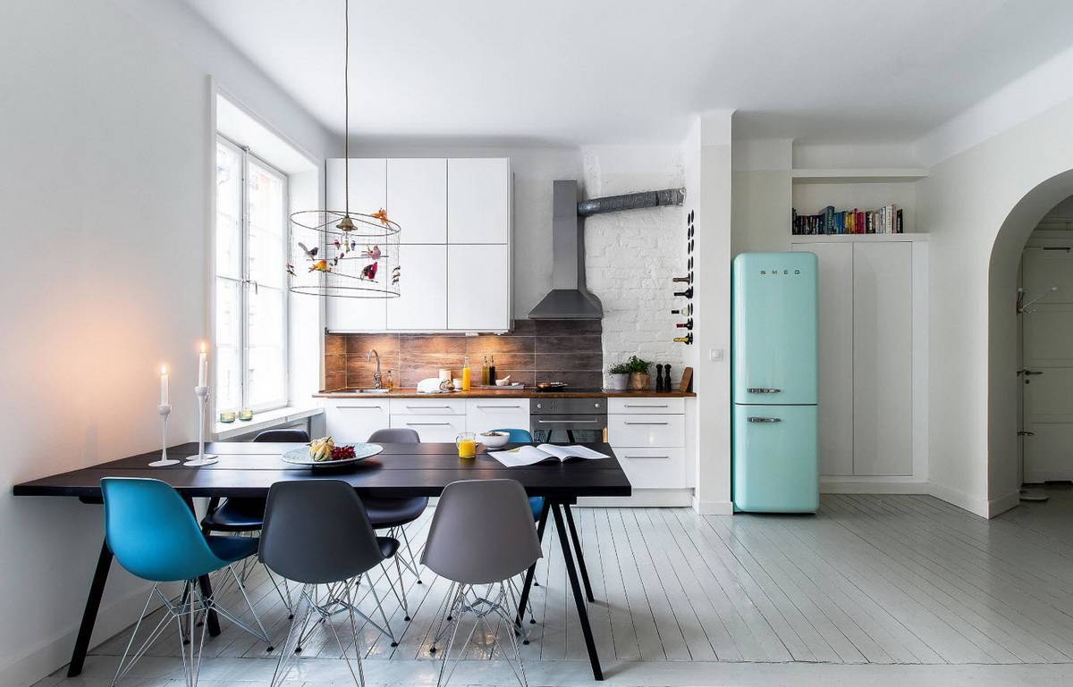 При создании кухни в варианте хай-тек понадобятся предметы с необычной или строгой формой. Скандинавский стиль требует белых оттенков, которые можно оттенить бирюзовыми вкраплениями.