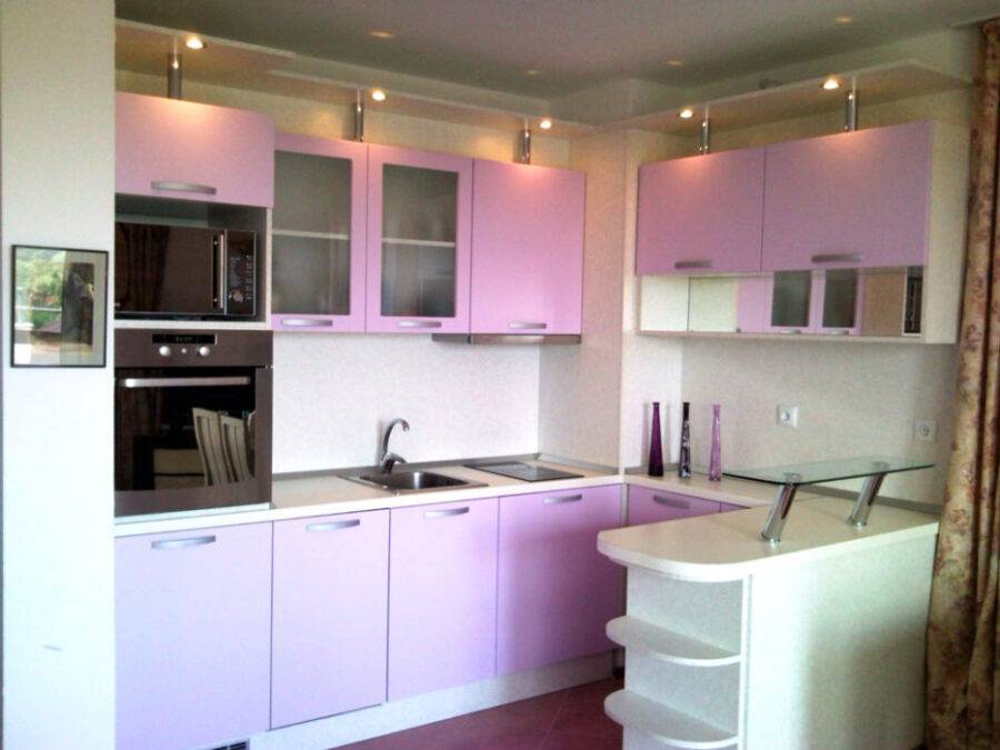 В просторном помещении хорошо смотрится лавандовый глянцевый гарнитур с белыми столешницами. Если планируете оформить таким образом кухню-гостиную, в качестве границы рекомендуем отказаться от перегородки в пользу барной стойки. Это и модно, и практично.
