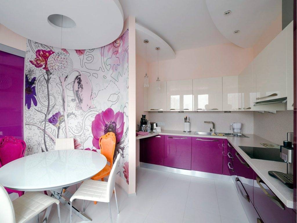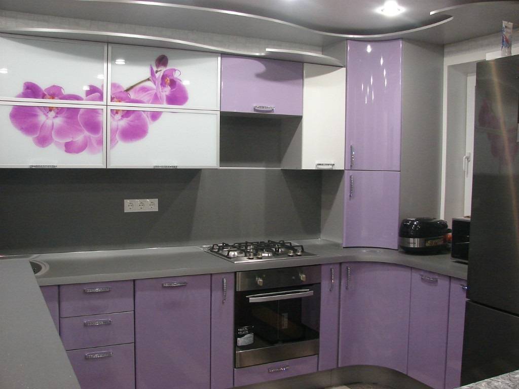 Зачастую данный цвет подбирают для кухонного гарнитура, который делают однотонным, двухцветным или с фиолетовым орнаментом. Широко распространены цветочные темы. Широкоформатное изображение орхидей, лилий, роз или сирени является отличной реализацией данного цвета в интерьере кухни.