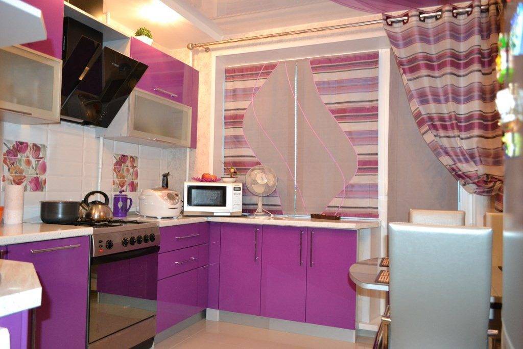 При выборе штор и занавесок для кухни в фиолетовом оттенке, хорошо делать ставку на воздушные легкие ткани. Длинные до пола шторы только подчеркнут еще более эффектно выбранный оттенок фиолетовой кухни. Очень темные и плотные шторы не будут хорошо сочетаться с фиолетовой кухней, но все же рассчитывайте и на свой вкус. Подходящими для штор и занавесок цветами являются цвета: розовый, темно-фиолетовый, фиолетовый или золотисто-желтый, светло-оранжевый, некоторые оттенки зеленого. Но все же зависит и от основного цвета кухни, конечно.