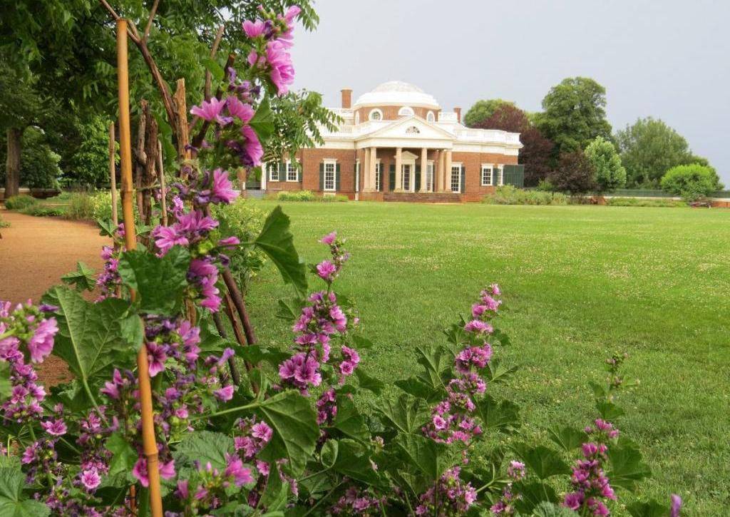 Фото цветов мальвы в саду прекрасно демонстрирует великолепие этого растения среди прочей живописной зелени.