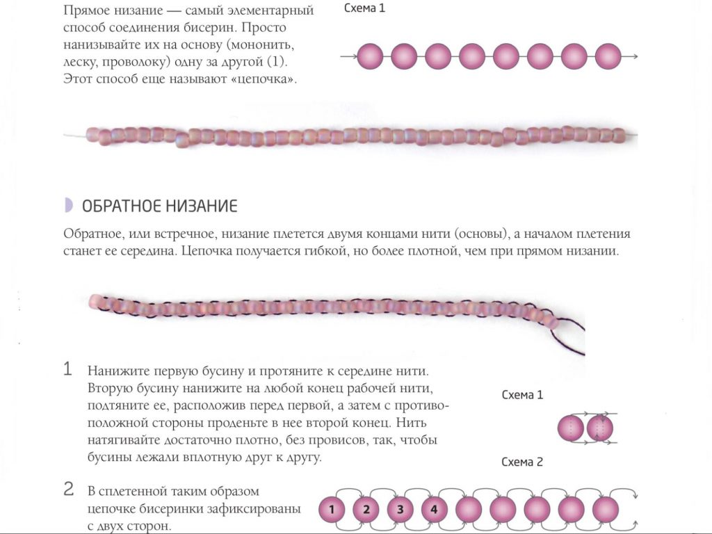 Любое плетение начинается с нанизывания (низания) бисера на нить. Низание бывает прямое и обратное: