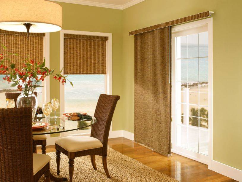 Для окон, выходящих на солнечную сторону, лучшим вариантом считаются жалюзи. Они представляют собой длинные, часто в пол, вертикально расположенные ламели. Их можно либо поворачивать вокруг своей оси, регулируя освещенность, либо они сдвигаются.