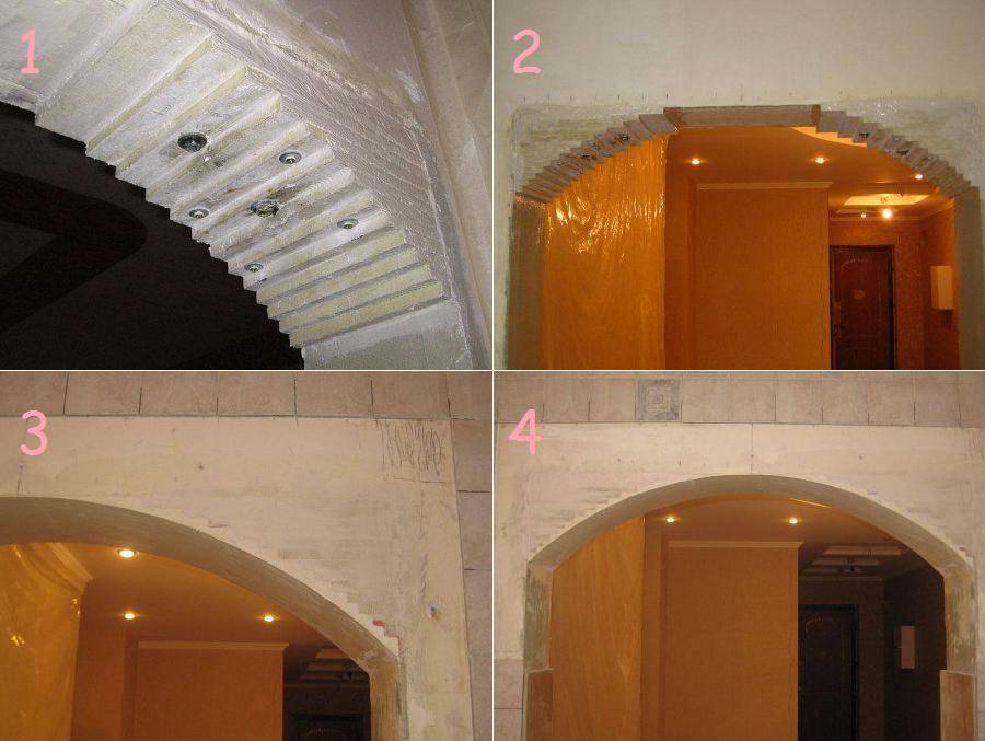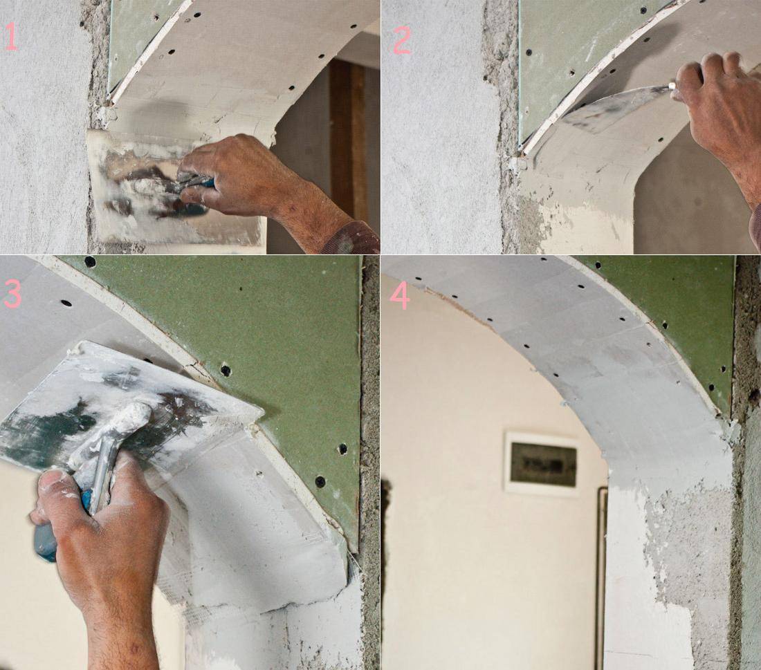 Чтобы пластины наверняка не отпадали, их периодически прикрепляют саморезами. Таких кусков может быть более десяти на каждый угол. Когда вся конструкция высохнет, то она шпаклюется таким образом, чтобы сгладить все углы от пластин. Теперь вы знаете, как сделать арку из гкл без профиля.